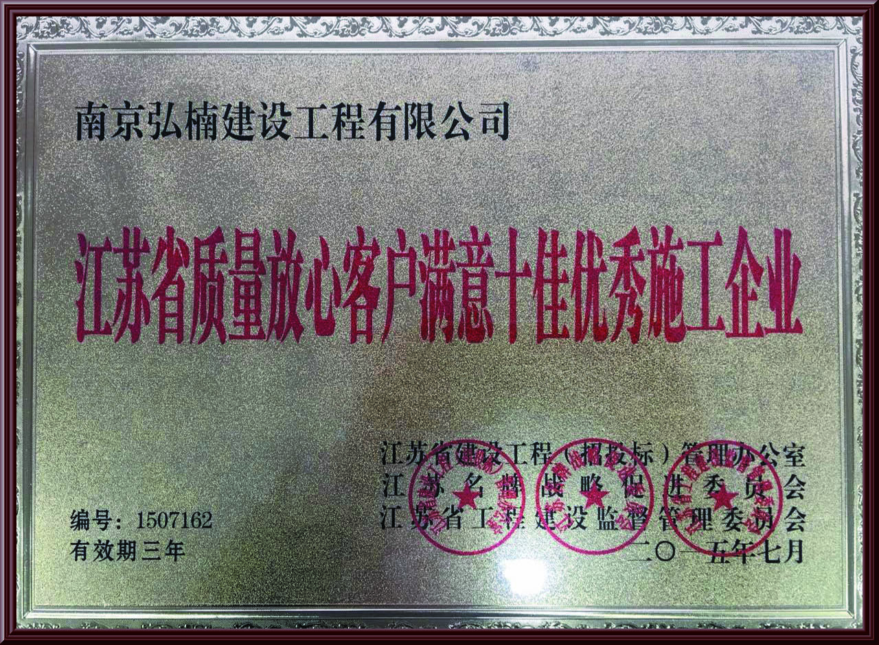 江蘇省質(zhì)量放心客戶滿意十佳優(yōu)秀施工企業(yè)