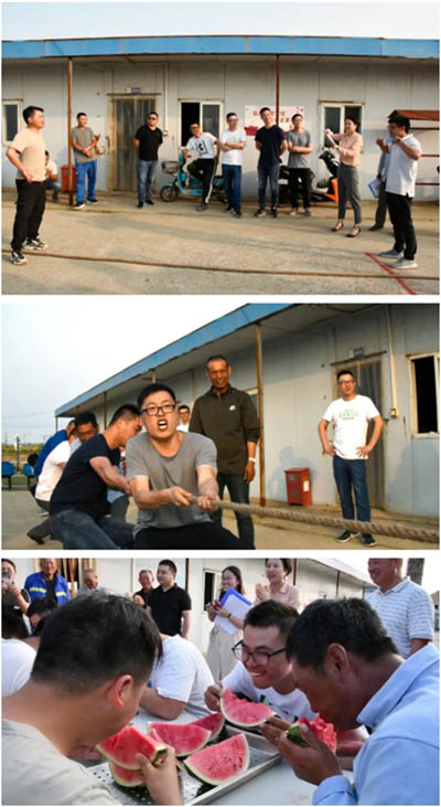 傍晚的濱海港微風習習,愜意涼爽,而項目工地上卻正是熱火朝天。公司此次組織了豐富的娛樂活動:你畫我猜、吃西瓜比賽、拔河比賽……員工們積極參與、踴躍報名、團結合作、力爭頭名,充分展示了項目部員工不怕吃苦,樂觀開朗,積極進取的“麻繩精神”。此外,項目食堂還準備了豐盛的晚宴,以回饋項目全體員工長期以來的辛勤付出。