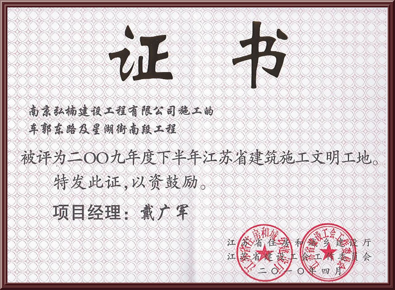 公司承建的車郭東路與星湖街南段工程被評為“二〇〇九年度江蘇省建設施工文明工地”